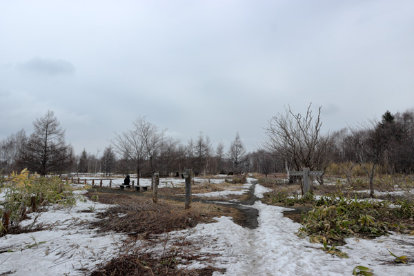 今朝の上空はドンヨリとした曇り空で、小雨が降っていたが次第に湿った雪に変わってきました。雨合羽を着て何時もの様に森林公園内を散策したが、野鳥たちは非常に少なかった。先ずは文教通り入口ゲートから入って直ぐの分岐点。雪解けが急ピッチで進んでいます。