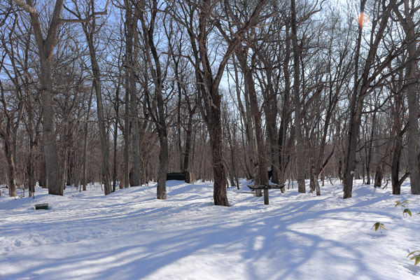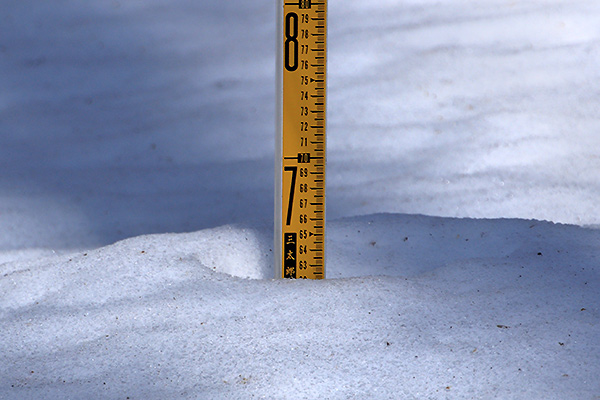 森林公園内に設置の雪尺。現在の積雪量は63センチ位。